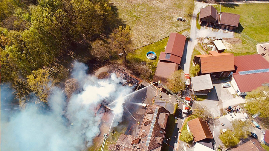 Rund 250 Einsatzkräfte der Freiwilligen Feuerwehren, Rettungsdienst, THW und Polizei wurden am Montag (28.04.) gegen 12:08 Uhr zu einer in Brand stehenden Scheune nach Braunersberg, einem Ortsteil von Mistelgau in der Gemarkung Obernsees, alarmiert.