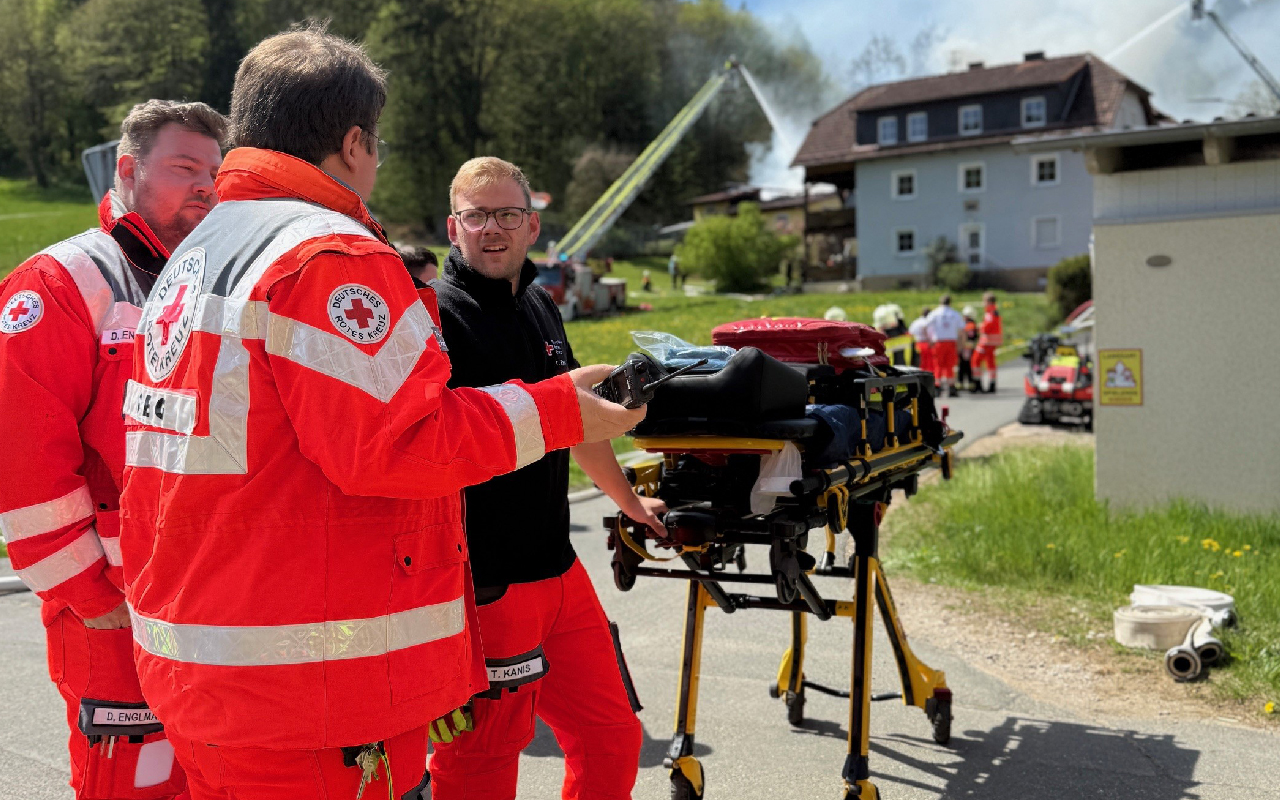 Vom Rettungsdienst waren zwei vom BRK Bayreuth gestellte Ein- satzleiter, ein Notarzt und insgesamt vier Rettungswägen des Bayreuther BRK und der Helfer vor Ort des BRK Hollfeld am Brandort.