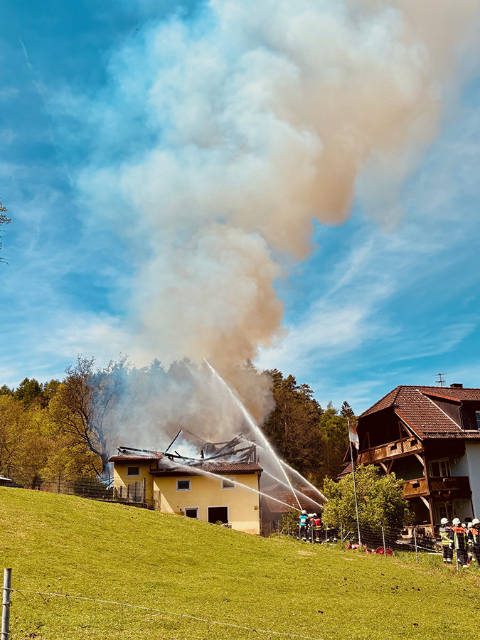 Zwei Ponys und mehrere Ziegen wurden wegen der anhaltenden starken Rauchentwicklung und unstetem Wind bei einem Nachbarn in Sicherheit gebracht.
