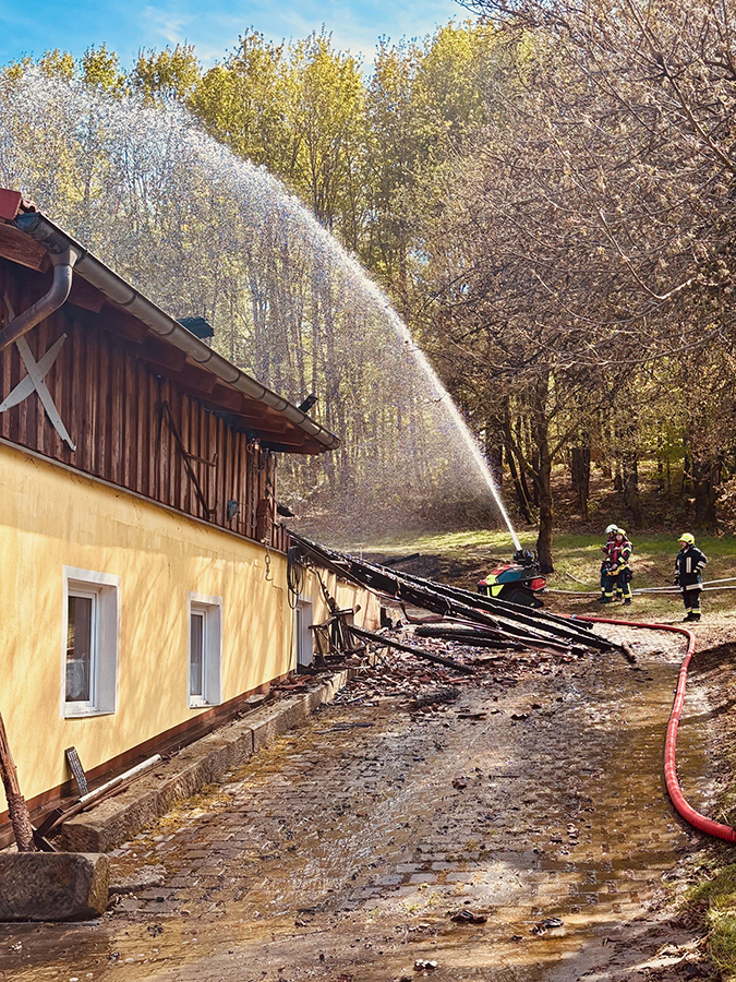 Aufgrund der Brandausbreitung und der bestehenden Einsturzgefahr konnten Atemschutzgeräteträger nicht wie üblich zur Brandbekämpfung in das Gebäude vorgeschickt werden. Die Brandbekämpfung übernahm einer von zwei eingesetzten Löschroboter. Der Zweite unterstütze beim Schutz des angrenzenden Waldes. Der Dachstuhl der Scheune brach circa 20 Minuten nach Alarmierung in sich zusammen. Im weiteren Verlauf stürzte auch die Scheunendecke ein. Nach Einsturz der Scheunendecke entfachte das heiße Brandgut die darunter liegenden Hackschnitzel. Dies erforderte eine weiter anhaltende Brandbekämpfung der Feuerwehr.